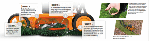 - Bis zu 30% Zeitersparnis: Kein Fangkorb, kein Entsorgen des Schnittguts bei gleichzeitigem Düngen des Rasens.