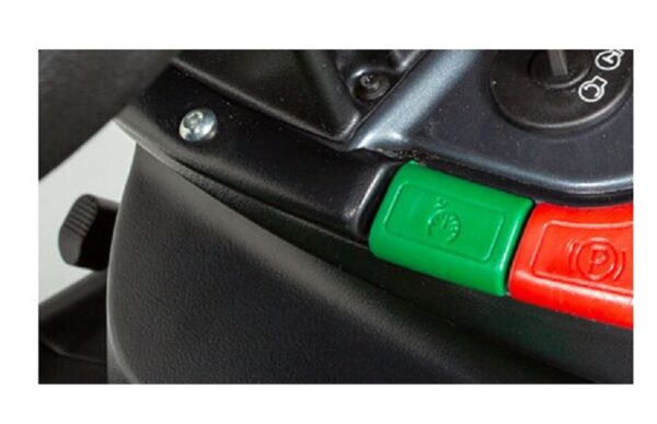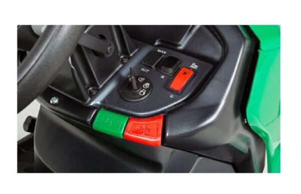 - Benutzerfreundliches Armaturenbrett: Kontroll- und Warnleuchten, Gashebel, Schalter für elektrische Messerkupplung, Optionsschalter für Rückwärtsmähen, Lenkrad, Tempomatschalter und Feststellbremshebel.