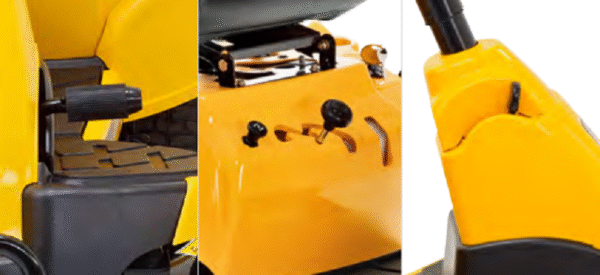 • Schnitthöheneinstellung und Mähwerkskupplung: Einfach einstellbare Schnitthöhe in 5 Positionen von 38 bis 95 mm, ergonomisch an der rechten Seite des Sitzes angebracht.