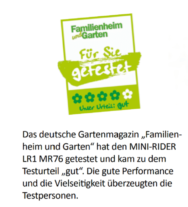 Das deutsche Gartenmagazin „Familienheim und Garten“ hat den MINI-RIDER LR1 MR76 getestet und kam zu dem Testurteil „gut“. Die gute Performance und Vielseitigkeit überzeugten die Testpersonen.