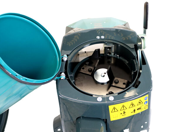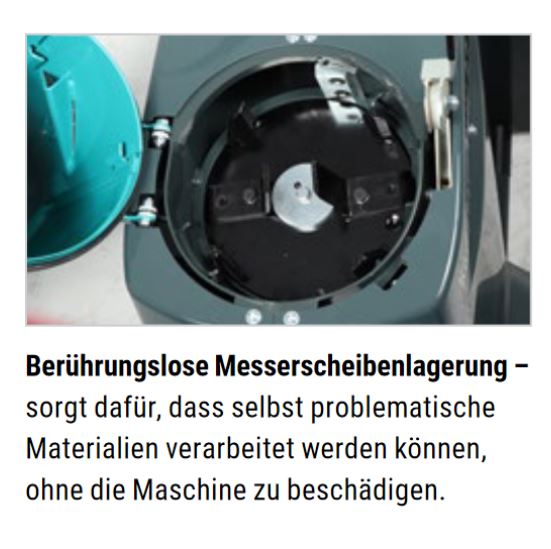 - Sicherheit: Mechanische Scheibenbremse stoppt die Messerscheibe sofort beim Öffnen des Trichters.