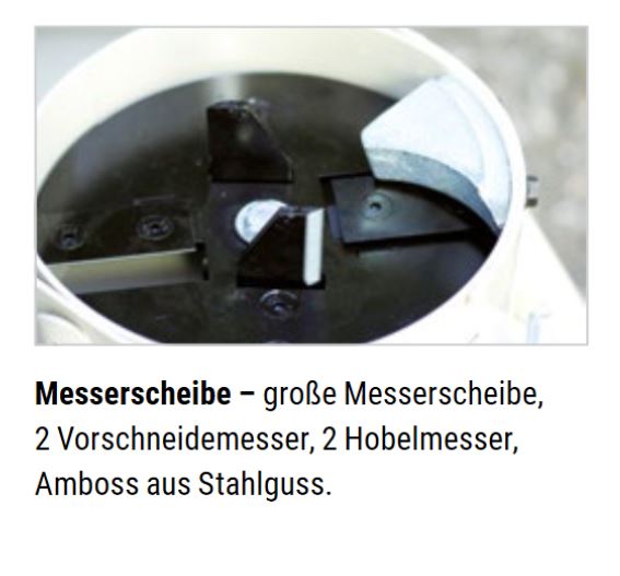 Ein besonderer Gartenhäcksler, prädestiniert für die Astzerkleinerung. Zweige werden über einen konkav geformten Amboß ins Zentrum der Messerscheibe geführt, wo blitzscharfe Messer das Holz in dünne Scheiben schneiden.