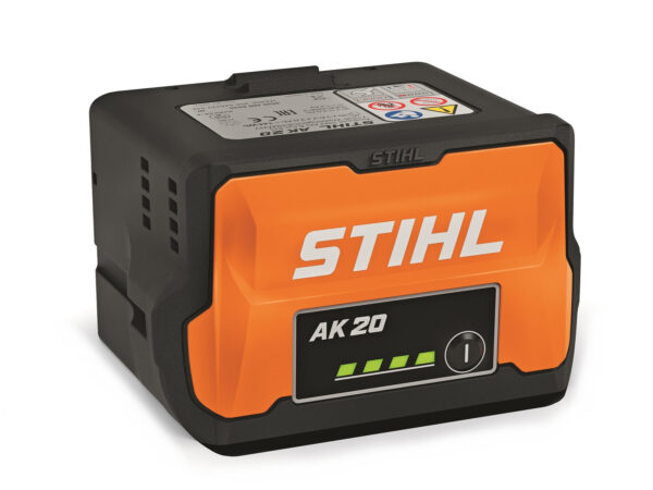 Ein geräuscharmer Akku-Rasenmäher, ideal für kleinere Rasenflächen, im Set mit Akku AK 20 und Standardladegerät AL 101.